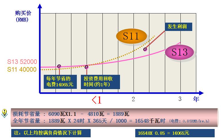 單臺(tái)預(yù)計(jì)節(jié)能效果 (500kVA) S13I級(jí)與S11國標(biāo)比較